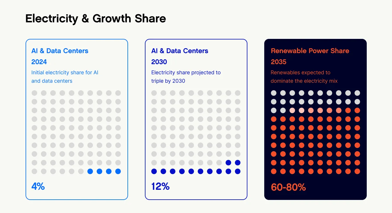 The industry faces unprecedented pressure to modernize. Demand is rising not just from electrification and renewables, but from the surge in computing, cloud, and AI-driven workloads putting new stress on power systems. Climate commitments are accelerating the shift toward renewables, while aging infrastructure competes for finite capital. Wind and solar energy are projected to provide 60-80% of generation in the least-cost electricity mix by 2035 in some models. Geothermal and certain forms of biomass are also considered clean energy.