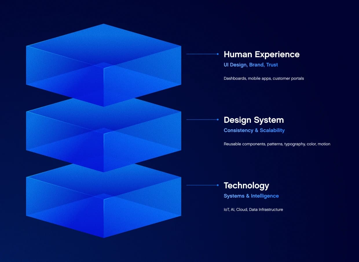 Every technology layer surfaces through an interface via dashboards, apps, and portals. A consistent design system ensures information looks and behaves predictably across tools.